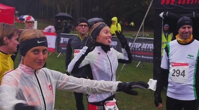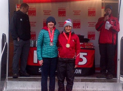 Sarah Davies and me on the 30-34 podium. Not many athletes hung about in the rain to receive prizes.