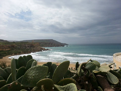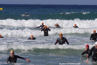 My first impression of Malta was how friendly everyone is, and what amazing old buildings and towns we passed on the way from the airport – it looked more like North Africa than Europe. No time to sightsee on arrival though – first stop Golden Sands beach to check out the swim location before it got dark! We made it just in time for a twilight recce – even through tinted goggles we could see the water was perfectly clear and calm. But that was the only time we would visit the bay without surf waves!