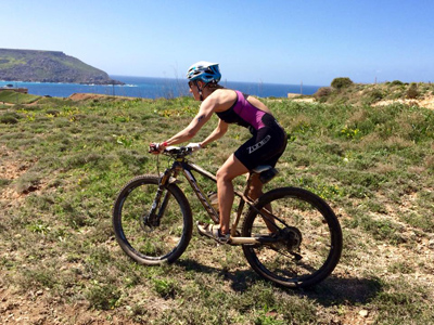 I knew there were some uber-bikers behind me though, not least my fellow GB teammate (and Commonwealth Games MTB-er) Jess Roberts. She promptly flew past up the first technical climb where I was still recovering my balance from the swim! My Aloha teammate Elisabetta Curridori was also in the mix, and on the second lap I managed to hang on to the wheel of Maud Golsteyn until the biggest climb. She had recovered the time lost on the swim… but was still recovering from racing Cape Epic MTB stage race only the week before – legend!